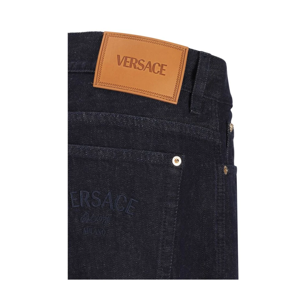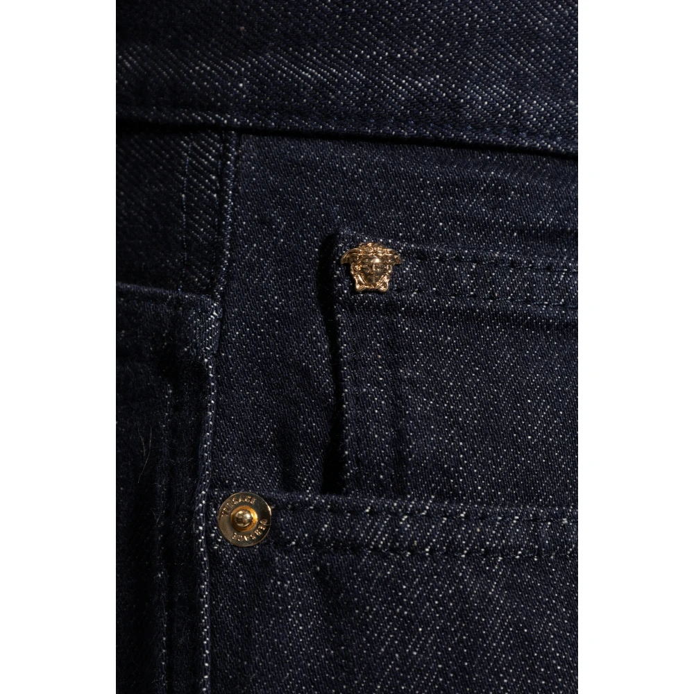 Versace katoenen jeans, rechte five-pocket stijl, ritssluiting en knoopsluiting aan de voorkant, riemlussen in de taille, iconische leren patch met merkprint op de achterkant