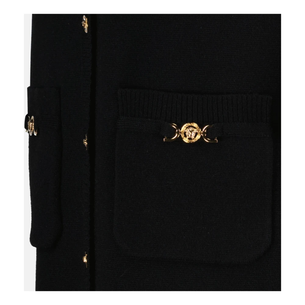 Upgrade je avondlook met de mouwloze zwarte jurk van Versace in zuivere wol en kasjmier. Met een chique Medusa-hoofdpatroon, kettingdetail en voor sluiting met Medusa-hoofdknopen. Deze boven de knie jurk met een Franse kraag en vier opgestikte voorzakken straalt luxe en comfort uit. Perfect voor verfijnde avonden