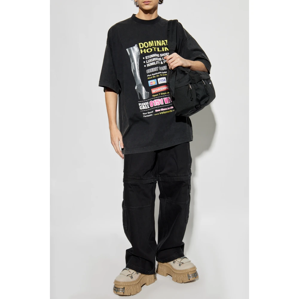 Maak kennis met het Gedrukte T-Shirt van het exclusieve merk Vetements, dat een unieke stijl en de hoogste kwaliteit vakmanschap combineert. Dit zwarte T-shirt met korte mouwen en ronde hals, volledig gemaakt van delicaat katoen, belichaamt de essentie van moderne straatmode. De voorkant heeft een Kleurrijke Print gestileerd als een hotline advertentie, die de aandacht trekt met slogans zoals