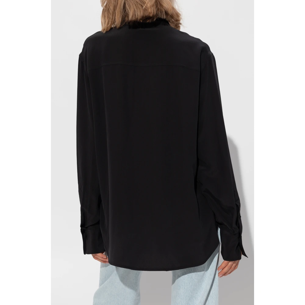 Presentatie van het Zijde Shirt uit de exclusieve collectie van Victoria Beckham. Dit uitzonderlijke shirt combineert een klassieke, losse pasvorm met modern design en belichaamt perfect verfijnde elegantie. Gemaakt van de hoogste kwaliteit Zijde, maakt het shirt indruk met zijn lichtheid en delicate glans. De subtiele ruche langs de sluitrand voegt buitengewone delicatesse en vrouwelijkheid toe. De klassieke kraag en geknoopte manchetten zorgen voor aanpassing van de mouwomtrek, wat zorgt voor draagcomfort. Het shirt is monochroom, gehouden in diep zwart, waardoor de minimalistische stijl wordt benadrukt. Het ontbreken van zichtbare ontwerperlogos aan de voorkant accentueert verder de elegantie en eenvoud. De verborgen knoopsluiting, die de knopen verbergt, voegt een vleugje subtiliteit toe. Waarom ZOU U DIT Product Kopen? * Hoogwaardige zijde zorgt voor comfort en elegantie. * Subtiele details en klassieke pasvorm passen perfect bij verfijnde mode. * Het minimalistische ontwerp maakt het shirt tot een veelzijdig kledingstuk. * Verstelbare manchetten zorgen voor extra comfort. * Ontworpen door de gerenommeerde ontwerper Victoria Beckham. Models metingen Hoogte: 177 cm Buste: 83 cm Taille: 61 cm Heupen: 89 cm Model draagt maat: 12
