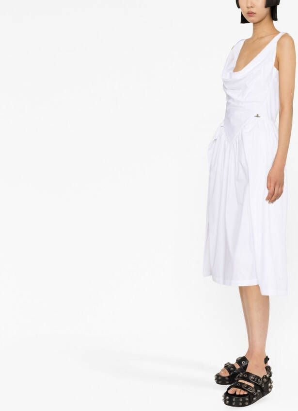 Wit, katoen, watervalhals, mouwloos, plooirok, verborgen ritssluiting op de rug en rechte zoom. .