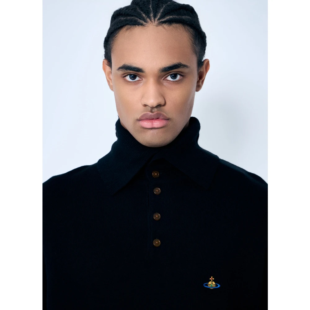 Verrijk je stijl met deze luxueuze Vivienne Westwood polo shirt van wol-en-kasjmiermix. Gemaakt in Itali, met een hoge kraag, knoopsluiting aan de voorkant, korte mouwen en logoborduursel op de borst. Gemaakt van 90% wol en 10% kasjmier. Alleen handwas.