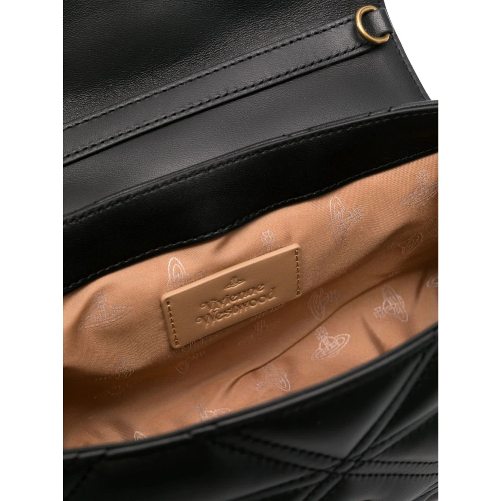 Upgrade je stijl met deze zwarte Vivienne Westwood schoudertas met een omslagtop met magnetische sluiting, afneembare schouderband, afneembare schakelketting schouderband en metalen voeten.