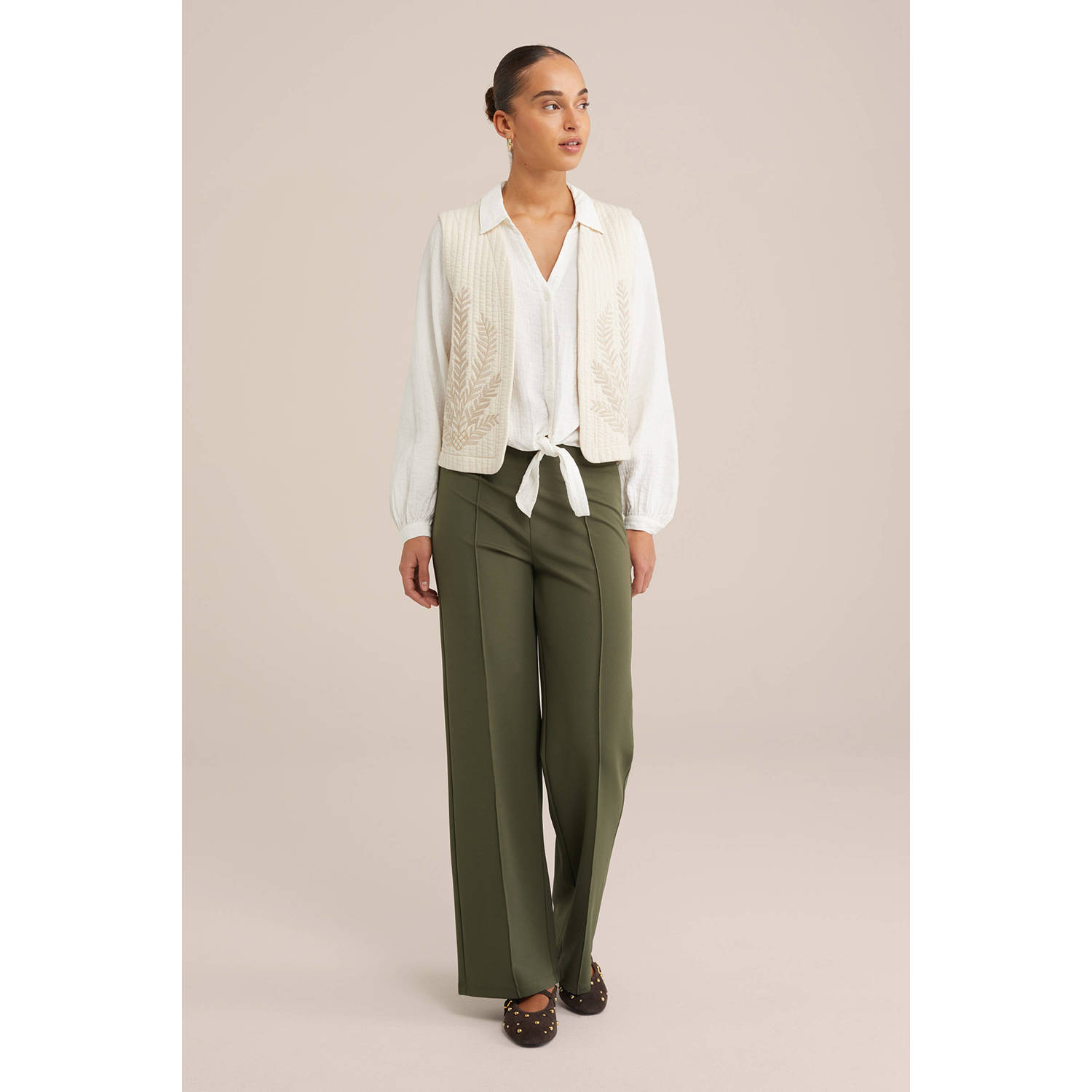 Deze blouse van WE Fashion is gemaakt van viscose en nylon. De blouse heeft een lang mouwontwerp en een V-hals. Op de voorkant vind je een knoopsluiting met een knoopdetail. De blouse heeft geen zakken.