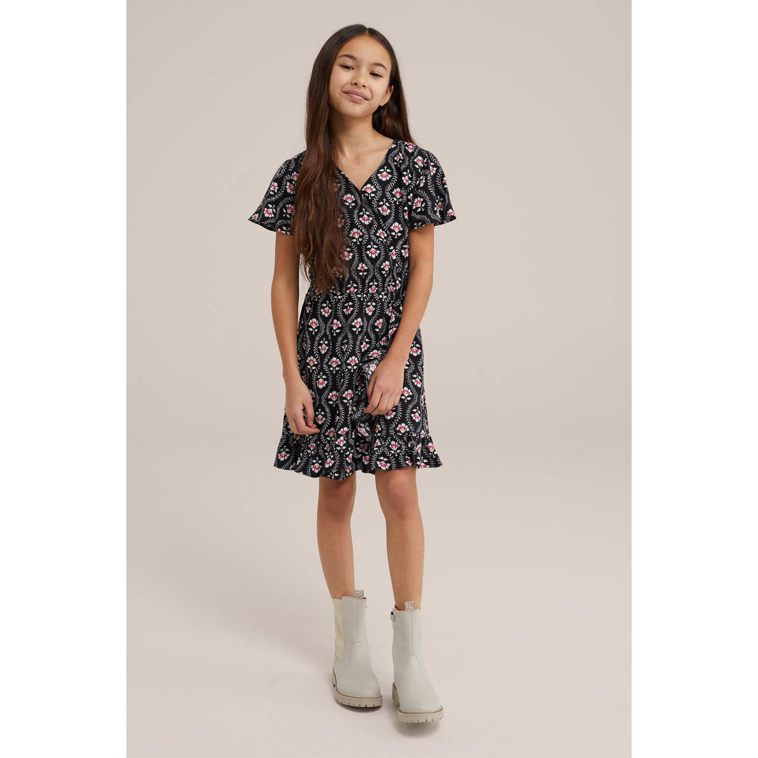 Deze meisjesjurk van WE Fashion is gemaakt van viscose en heeft een all over print. Het model beschikt over een drukknoopsluiting. De jurk met korte mouwen heeft verder een V-hals.details van deze jurk:ruches