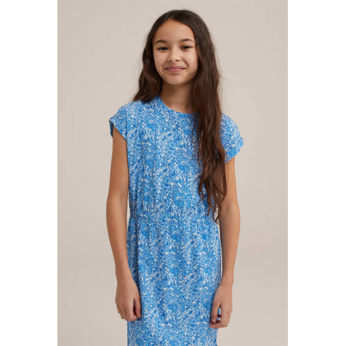 Deze meisjesjurk van WE Fashion is gemaakt van stretchkatoen en heeft een paisley-motief. De jurk met korte mouwen heeft verder een ronde hals.details van deze jurk:elastische taille