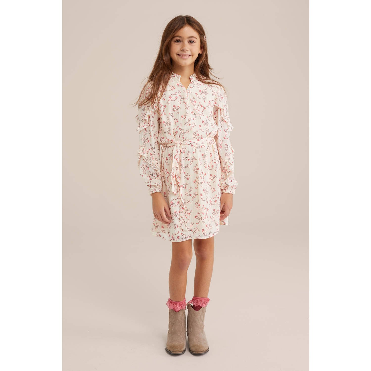 Deze jurk voor meisjes van WE Fashion heeft een ecru/roze kleur en is gemaakt van 100% viscose. De jurk heeft lange mouwen, een V-hals en knoopsluiting. Het ceintuur en de ruches geven een speelse touch.