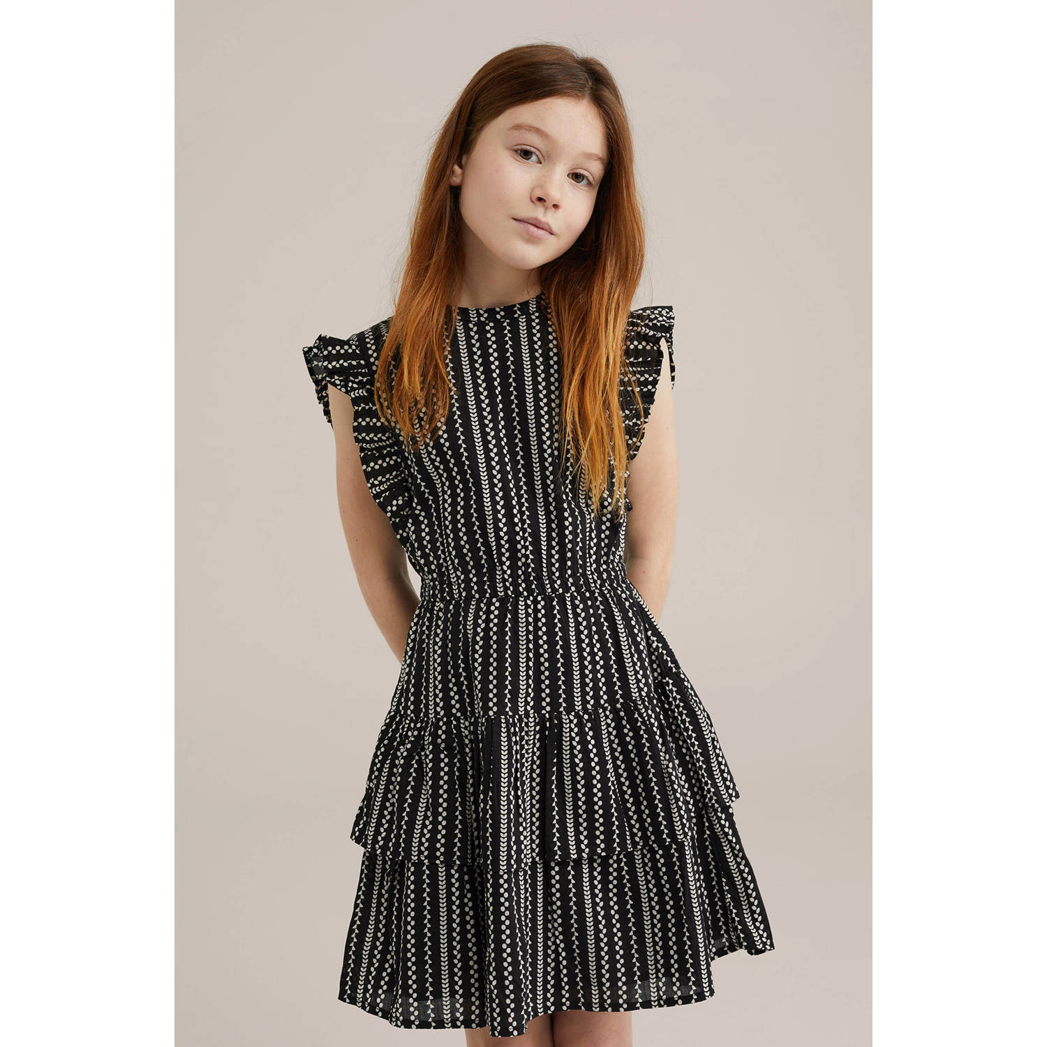 Deze meisjesjurk van WE Fashion is mouwloos met een ronde hals en gemaakt van 100% polyester. De lichtgroene jurk heeft een knoopsluiting, strikdetail en smockwerk. De jurk heeft een volant voor extra flair.