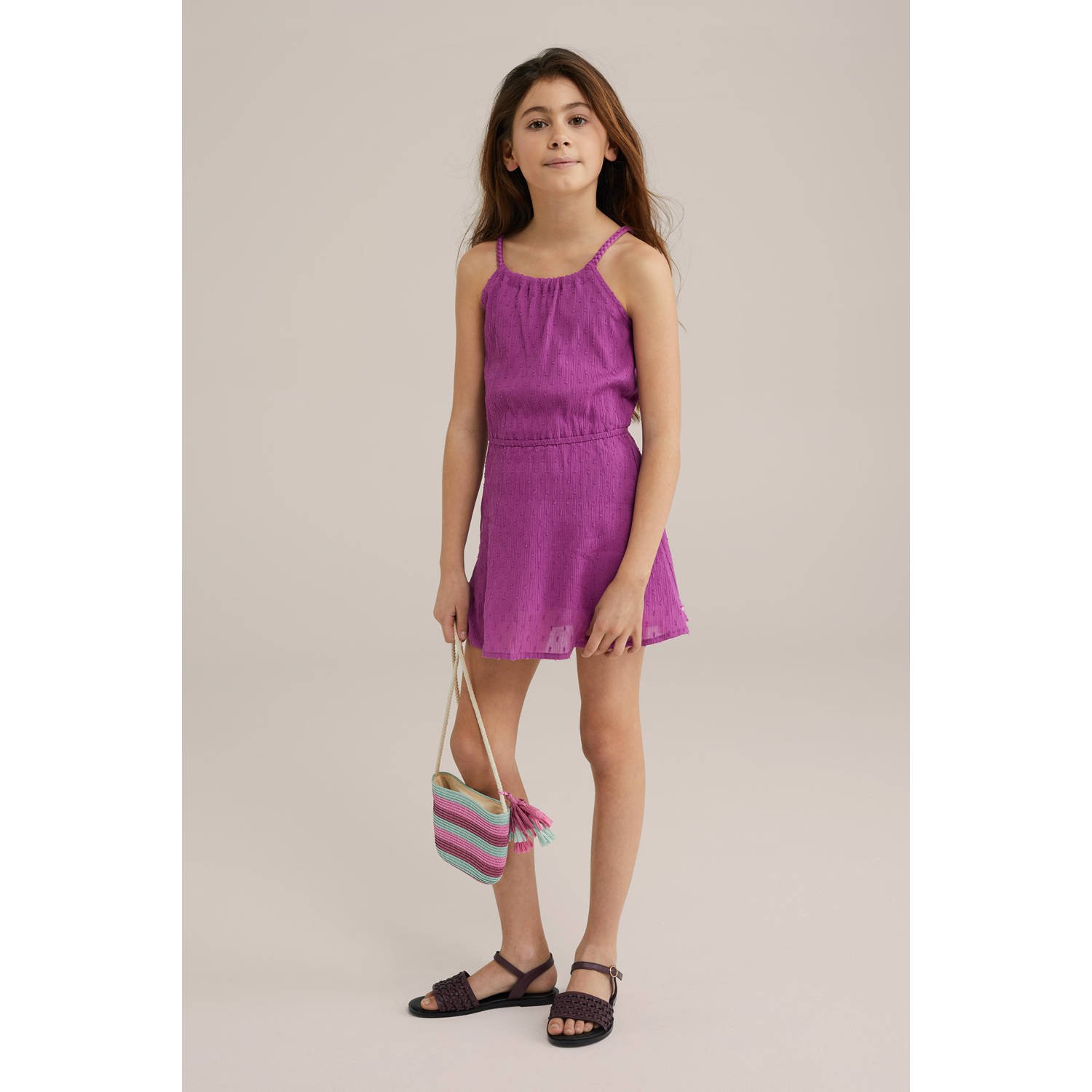 Deze meisjesjurk van WE Fashion komt in de kleur pencil purple en is gemaakt van 100% katoen. De jurk heeft een knoopsluiting, ronde hals en is mouwloos. De jurk heeft een vlechtwerk en plooien.