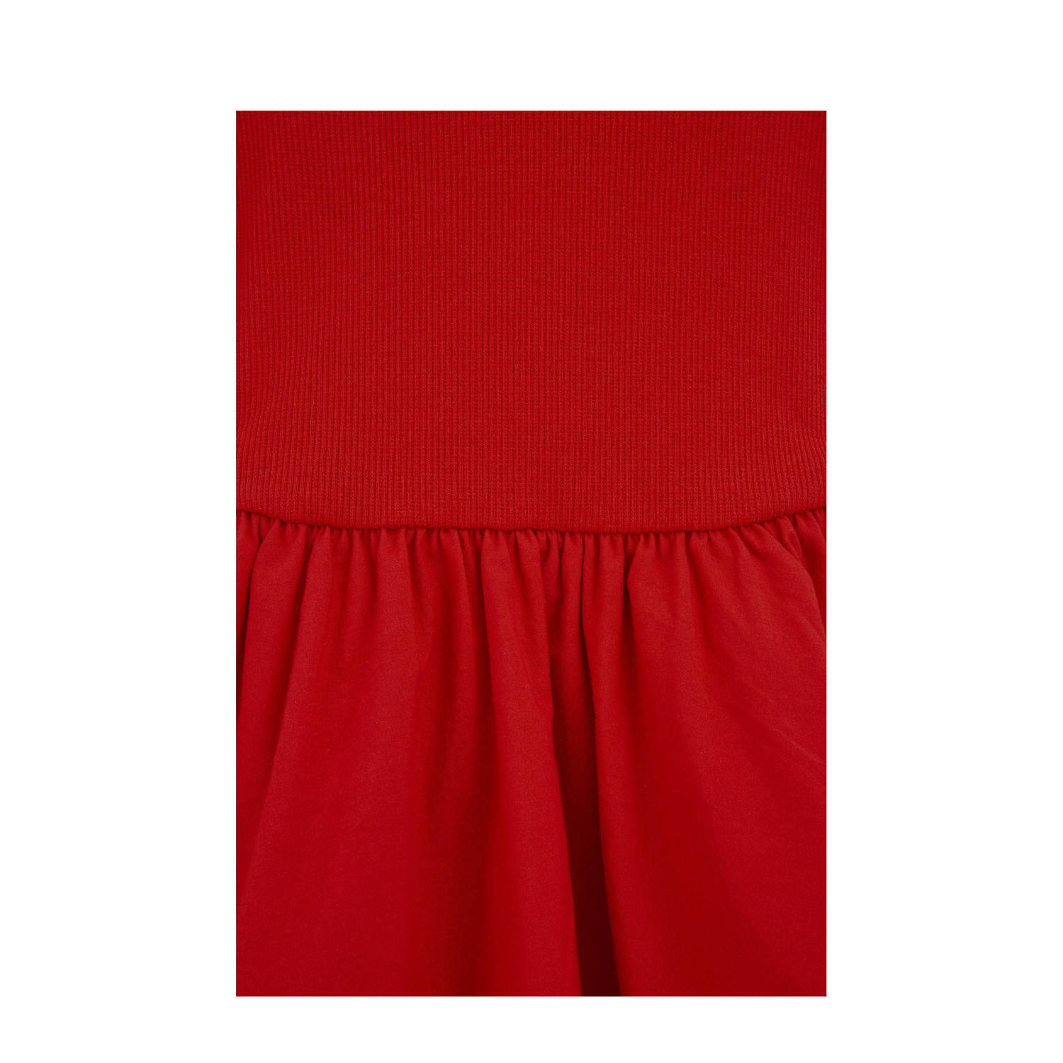 Deze jurk van WE Fashion heeft een elastische tailleband. De ronde hals en korte mouwen maken het comfortabel. Het rode ontwerp met plooien en volant geeft een speelse uitstraling. Gemaakt met katoen en elastaan.