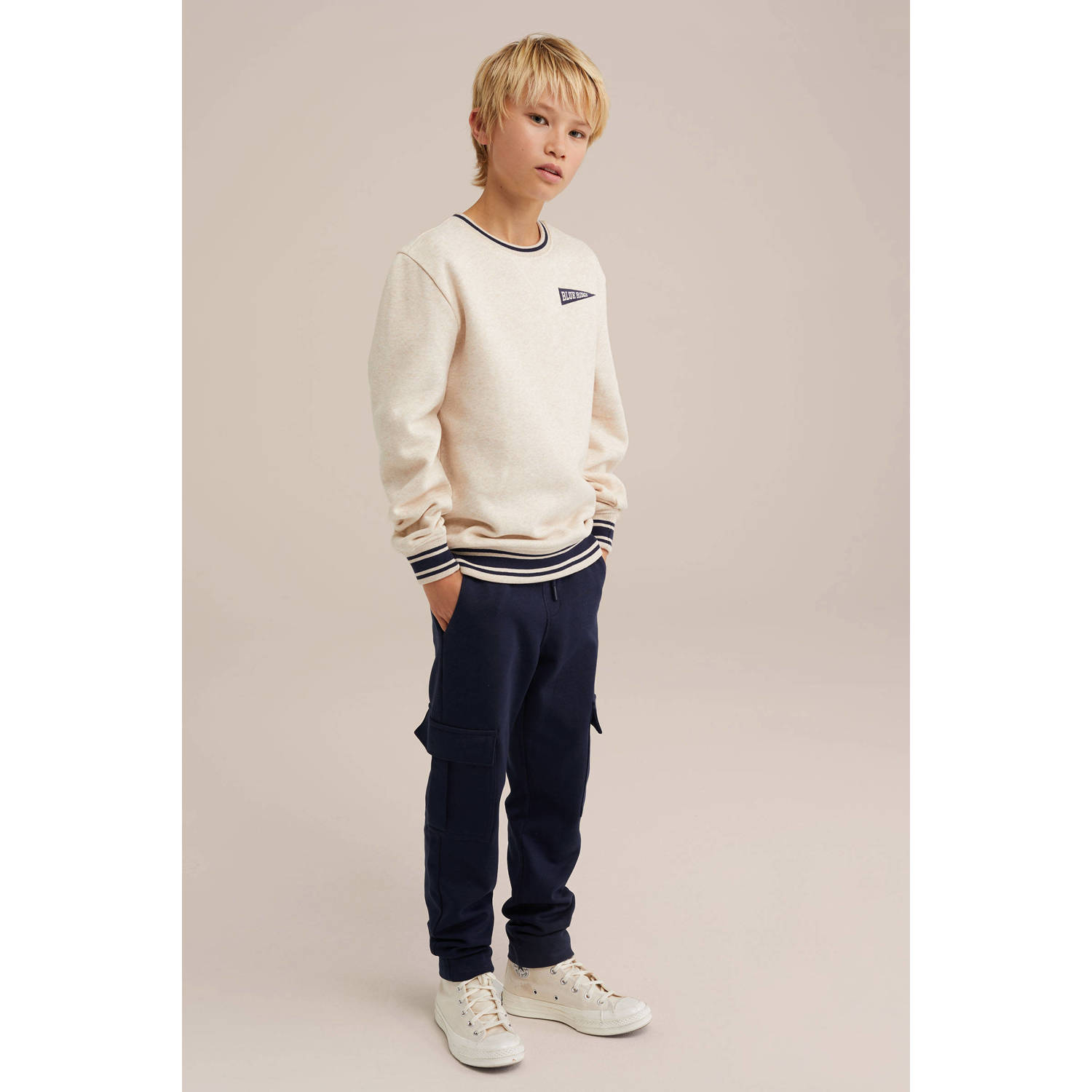 Deze WE Fashion broek voor jongens heeft een slim fit. Gemaakt van polyester-katoen in royal navy. De elastische tailleband met koord zorgt voor draagcomfort. Voorzien van broekzakken en cargozakken voor gemak. Perfect voor casual gelegenheden.