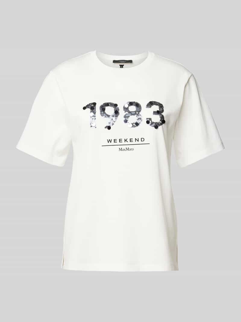T-shirt van Weekend Max Mara voor dames. Puur katoen. Recht model. Model 'CABINA'. Ronde hals. Labelprint. Met pailletten. Ruglengte bij maat S: 41 cm