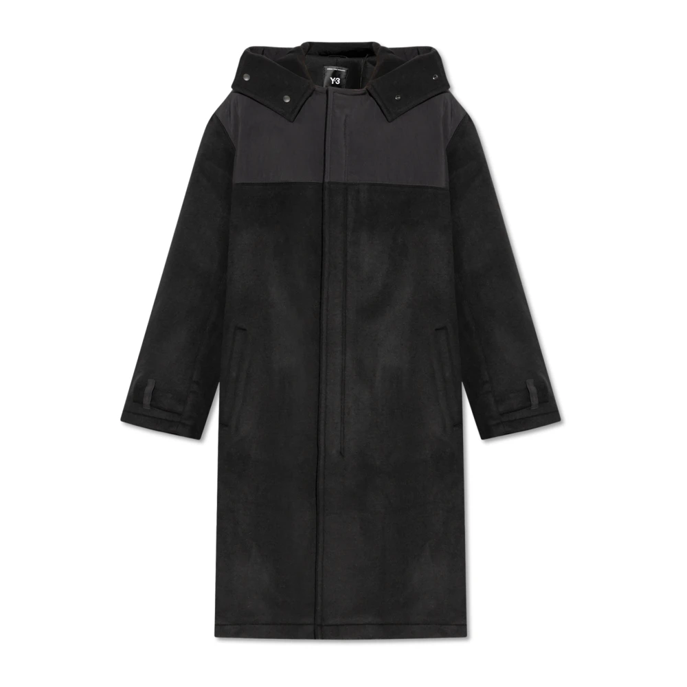 Blijf warm en stijlvol in deze zwarte Yohji Yamamoto Pour Homme wollen en kasjmierjas voor mannen. Met capuchon, lange mouwen, knoopsluiting aan de voorkant, twee voorzakken en een riem in de taille. Model is 179 cm lang en draagt maat 3.