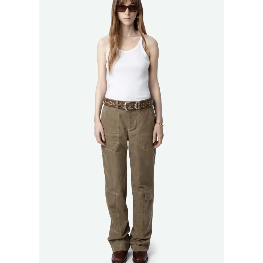Zadig & Voltaire broek. Wijde bruine corduroy broek met zakken en gepijpte lussen. - Wijde bruine corduroy broek voor vrouwen - Ritssluiting en knoopsluiting met zilveren afgezette riemlussen - 2 grote voorzakken, 1 zijzak in cargostijl en 2 opgestikte achterzakken - Knie- en manchetopeningen. Model is 175 cm lang en draagt maat 36. Dit model valt normaal, dus we raden aan om je gebruikelijke maat te kiezen. Samenstelling 98% Katoen** 2% Elastaan **Vezels afkomstig van biologische landbouw Verzorging - Dit artikel moet uitsluitend chemisch gereinigd worden. - Strijk binnenstebuiten op max. 110C, vermijd decoratieve details.