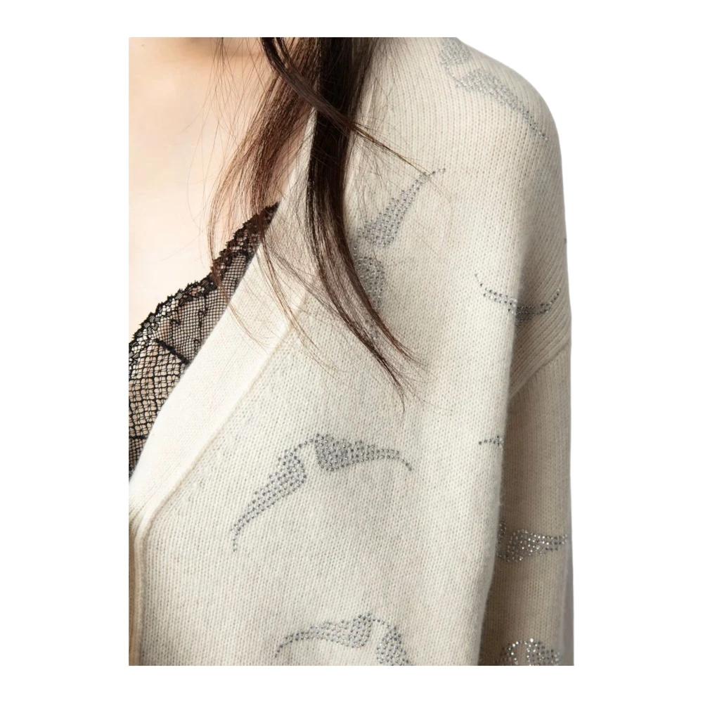Elegante ecru cardigan van 100% kasjmier met knoopsluiting en volledig met diamanten versierde mouwen van Zadig & Voltaire, perfect voor de stijlvolle vrouw.