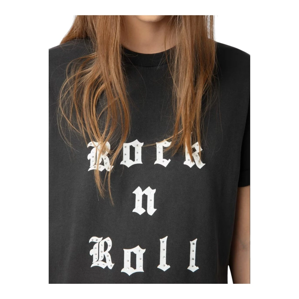 Upgrade je casual look met deze Zadig & Voltaire dames T-shirt. Deze oversized katoenen tee heeft een ronde hals en een medium pasvorm, en is versierd met een rock'n'roll print met strass steentjes aan de voorkant. Compleet met geribbelde ronde hals en korte mouwen, is deze tee een stijlvolle keuze voor elke dag. Model is 176 cm / 5' 9 en draagt maat S. Dit item valt normaal qua maat. Samenstelling: 100% Katoen.