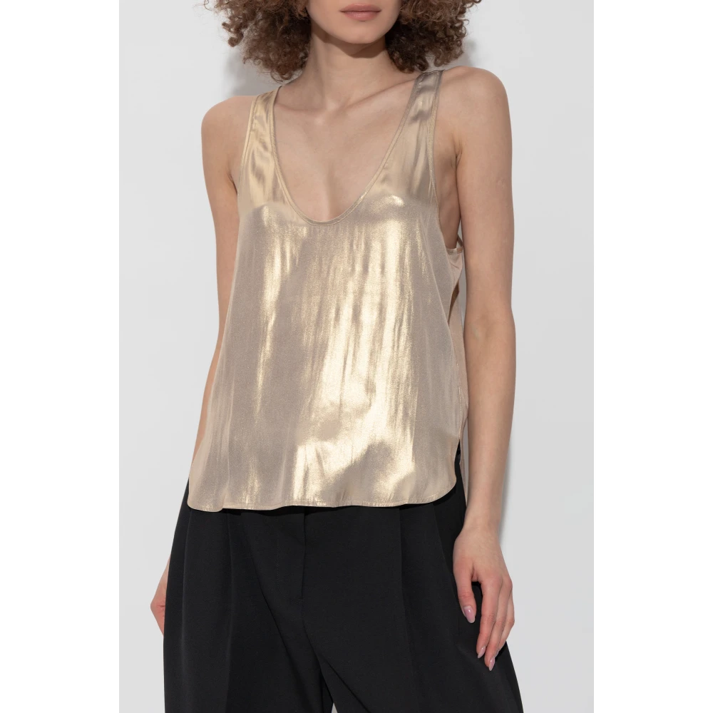 Presentatie van de "Tarys" TOP uit de exclusieve Zadig & Voltaire collectie. Dit uitzonderlijke kledingstuk is het toonbeeld van elegantie en moderne stijl, betoverend op het eerste gezicht. De dominante Gouden Kleur en glanzend materiaal geven het een luxueuze uitstraling, perfect voor avondjes uit of formele gelegenheden. De