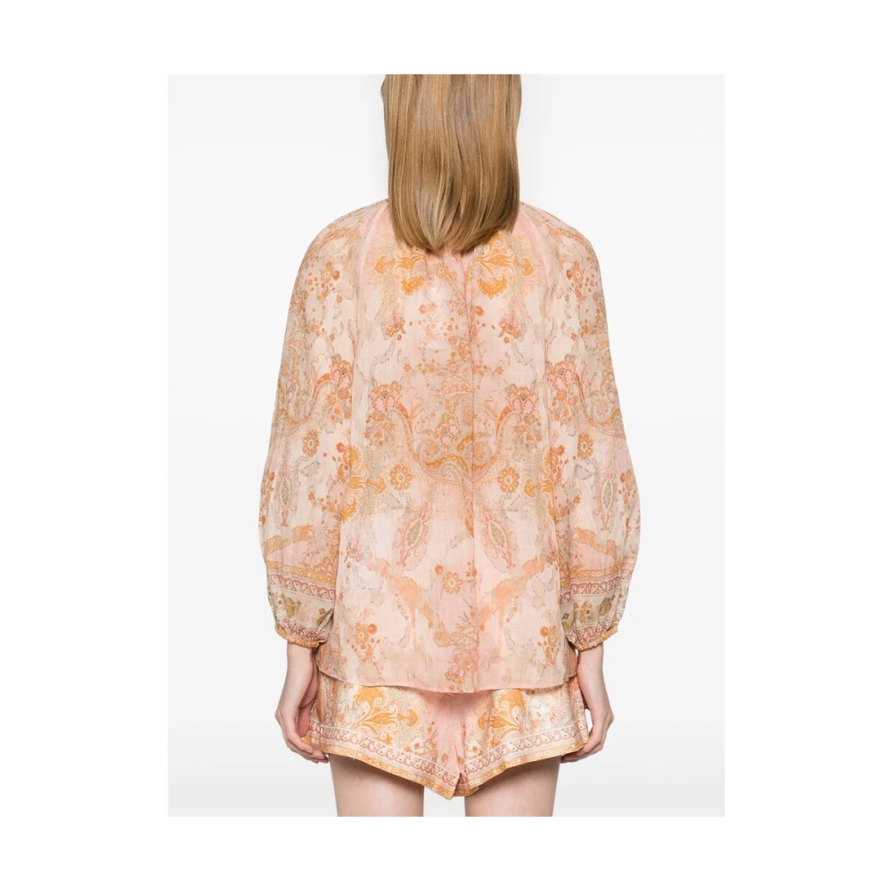 Upgrade je garderobe met deze Zimmermann blouse met lichtroze/multikleurige ramie mix, knoopsluiting aan de voorkant, acaciaprint overal, hoge hals, lange raglanmouwen, elastische manchetten en afgeronde zoom.