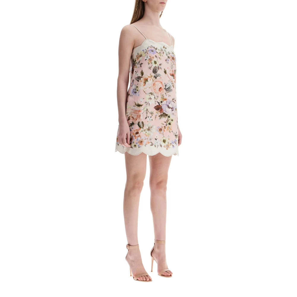 Upgrade je stijl met deze Zimmermann Mini Jurk in roze bloemen linnen. Met een geschulpte halslijn is deze elegante en lichte jurk perfect voor lente-zomer. Veelzijdig voor zowel dag- als avondevenementen, belichaamt het de verfijnde stijl van het Australische merk.