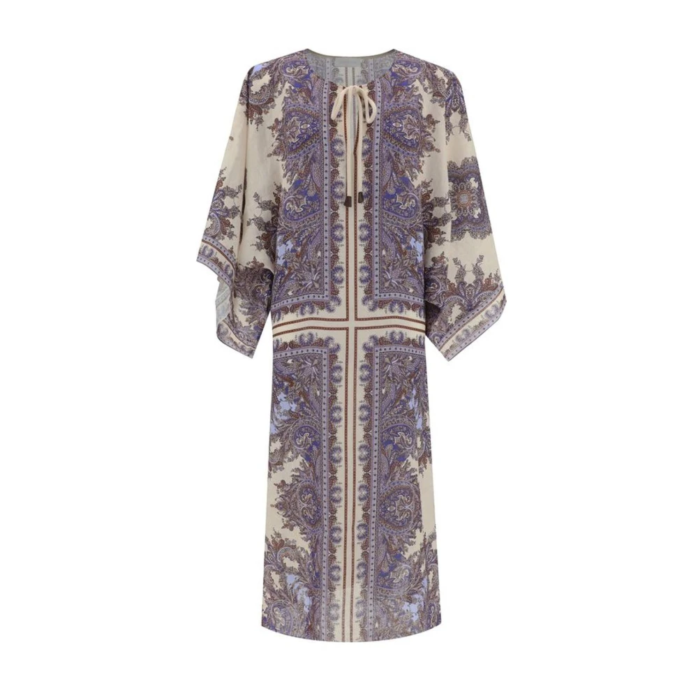 Upgrade je garderobe met deze Zimmermann Caftano Ottie jurk in beige/multicolor linnen stof. Met paisley print, ronde halslijn met sleutelgat, wijde lange mouwen, zijsplitten, ongevoerd ontwerp en rechte zoom. Perfect voor een stijlvolle en comfortabele daglook