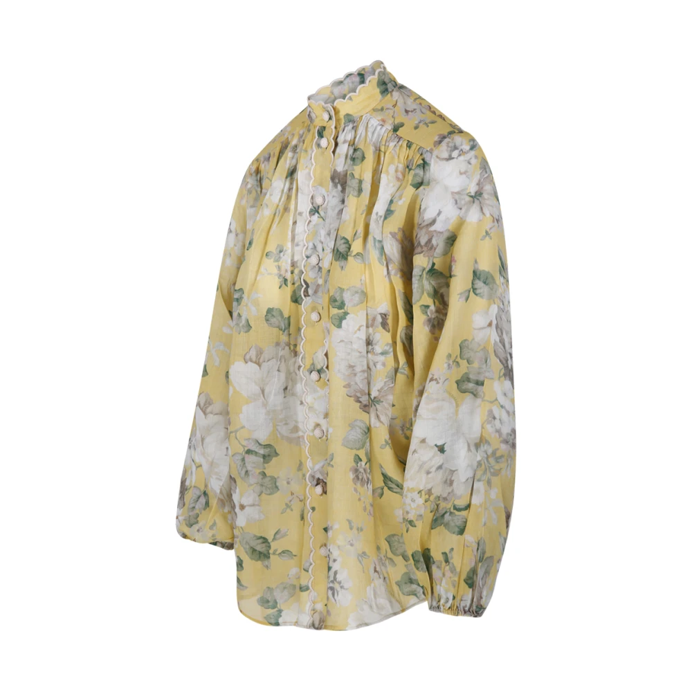Upgrade je garderobe met deze Zimmermann Yellow Floral Acacia Scallop Blouse, gemaakt van 100% ramie stof.