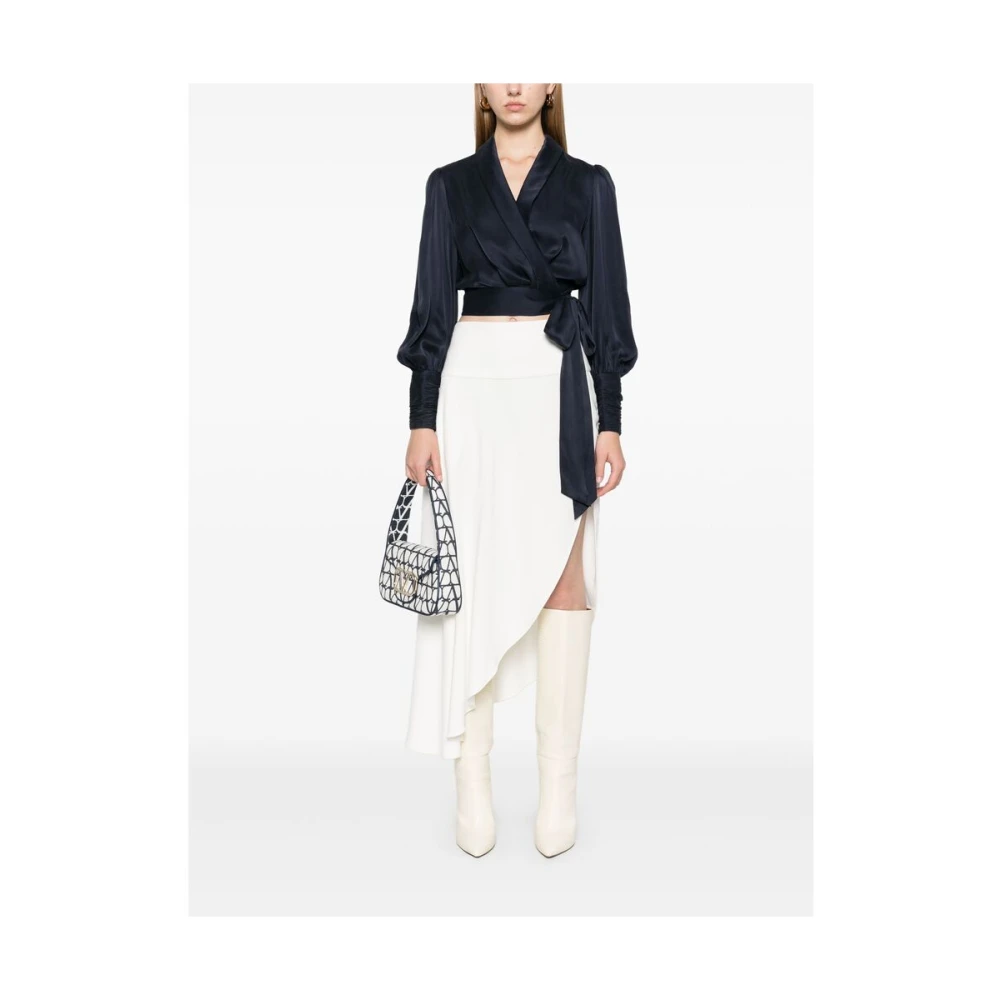 Upgrade je garderobe met deze Zimmermann navy blauwe zijden satijnen blouse met wikkelontwerp, zelfbindende sluiting, overslaghals, lange pofmouwen met manchetritsen en een stijlvolle cropped lengte.