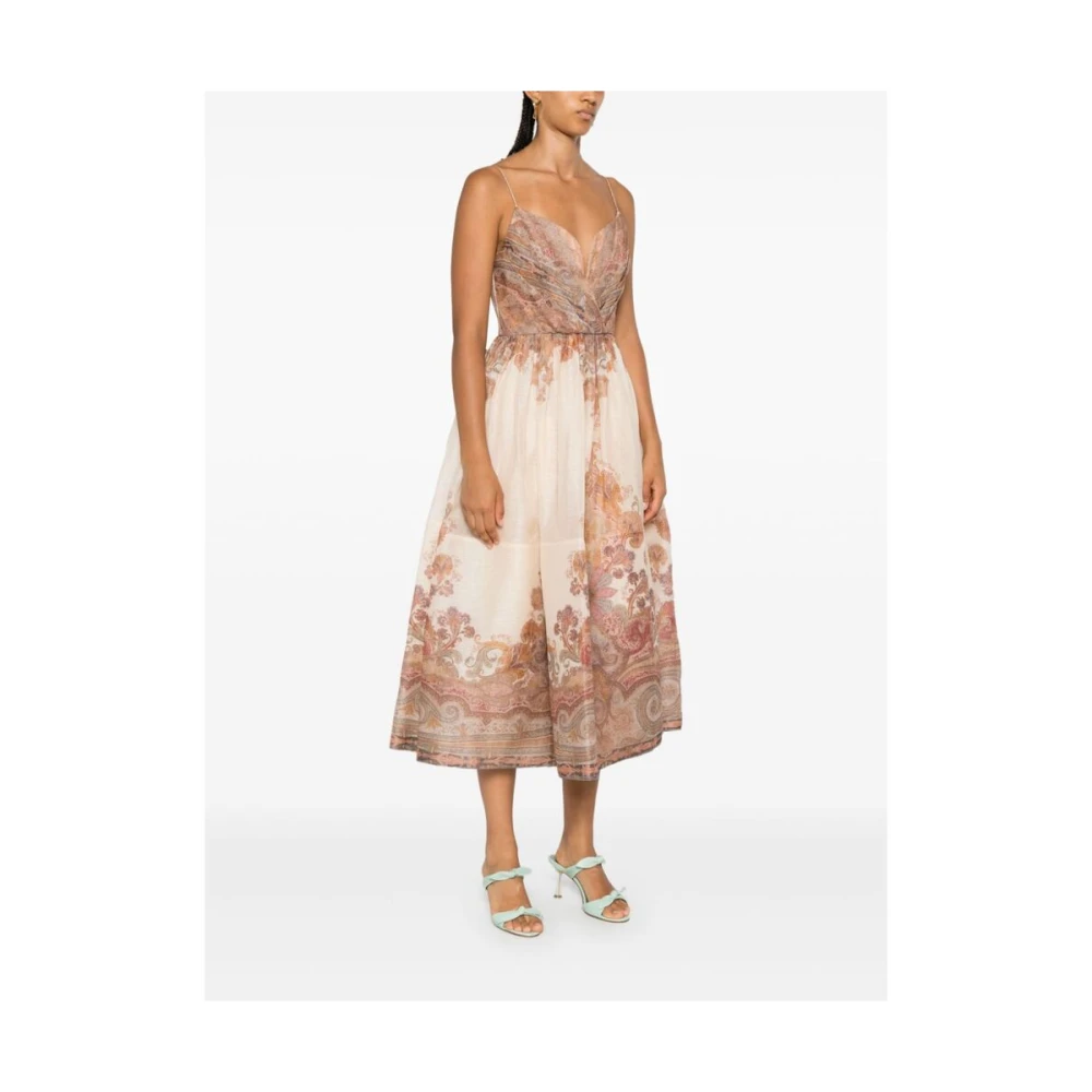 Upgrade je stijl met deze Zimmermann beige multicolor paisley print midi jurk. Met een V-hals, mouwloos ontwerp en spaghettibandjes is deze jurk perfect voor elke vrouwelijke garderobe. De gedrapeerde details, zijzakken en volumineuze rok voegen een vleugje elegantie toe. Gemaakt van een linnen-zijde mix is deze jurk zowel stijlvol als comfortabel. Lengte: 120, 0 cm, Taille: 68, 0 cm, Buste: 78, 0 cm.