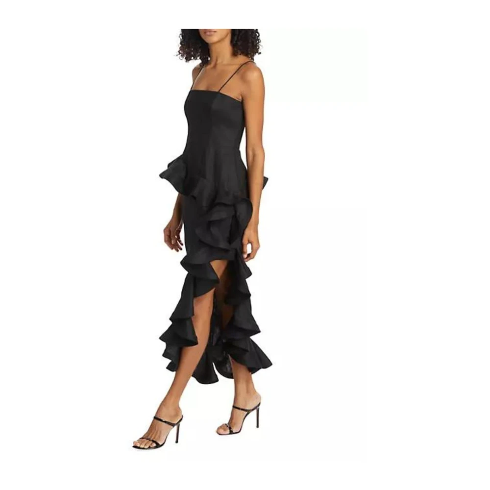 Maak een statement met de Harmony Tango Dress in het zwart van Zimmermann. Deze linnen midi-jurk uit de Natura-collectie heeft een flatterende aansluitende lijfje met zijnaad baleinen voor een gestroomlijnde silhouet. De chique vierkante halslijn en speelse ruches stralen vrouwelijke charme uit, terwijl verstelbare rouleau-schouderbanden veelzijdigheid toevoegen. Compleet met een ritssluiting in het midden achter voor gemakkelijk dragen.
